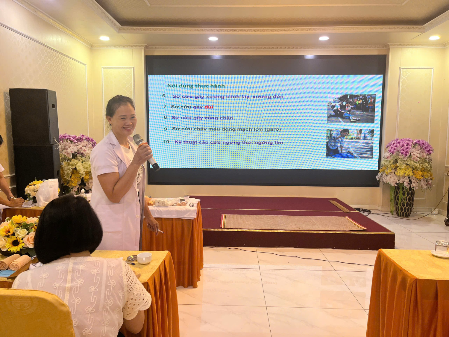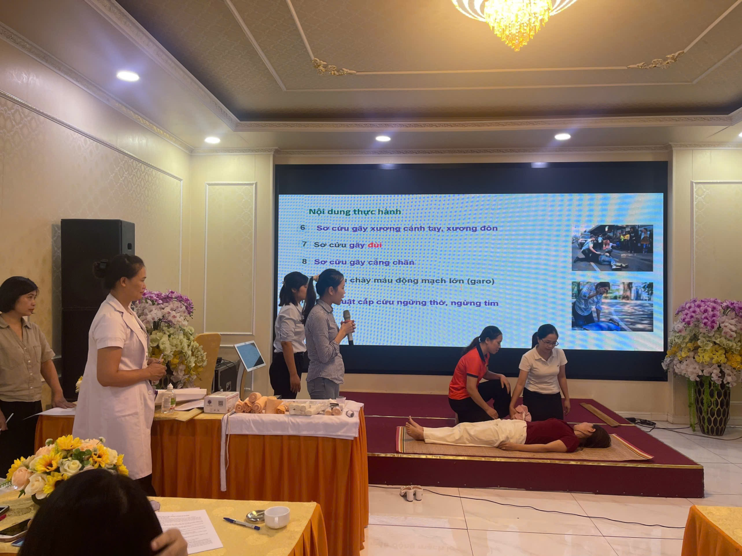 • Thực hành các kỹ thuật sơ cấp cứu cơ bản như ép tim ngoài lồng ngực, hô hấp nhân tạo, cầm máu, cố định tạm thời;