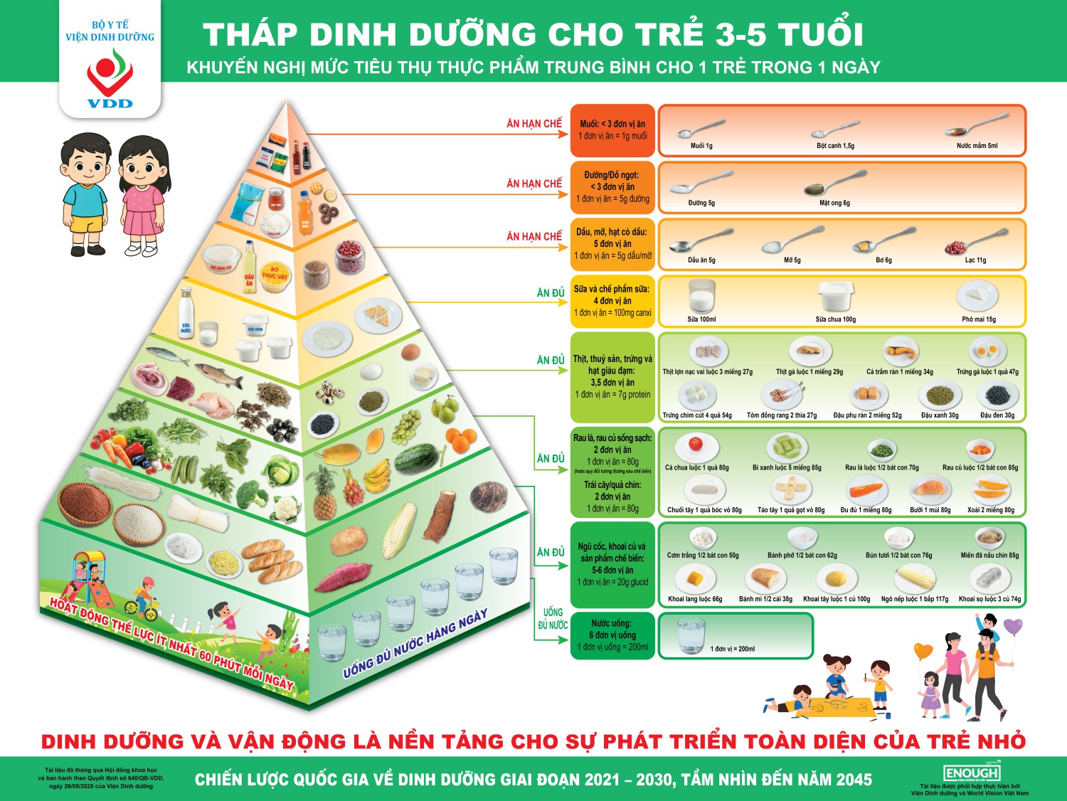 Chế độ dinh dưỡng cho trẻ 3 đến 5 tuổi cần đủ về số lượng và cân đối về chất lượng. Trẻ 3-5 tuổi cần khoảng 1.230 – 1.320 kcal mỗi ngày, tùy theo giới tính. Năng lượng này nên được phân bổ cân đối giữa các nhóm chất sinh năng lượng: chất đạm (protein) cung cấp khoảng 13% – 20% năng lượng khẩu phần, chất béo (lipid) cung cấp khoảng 25% – 35% năng lượng khẩu phần và chất bột đường (glucid) cung cấp khoảng 52% – 60% năng lượng khẩu phần. Bữa ăn của trẻ còn cần sự cân đối giữa đạm động vật và đạm thực vật, trong đó đạm động vật nên chiếm ít nhất 60%, có sự cân đối giữa chất béo động vật và chất béo thực vật, tỷ lệ chất béo có nguồn gốc động vật và chất béo có nguồn gốc thực vật trong khẩu phần ăn của trẻ được khuyến nghị là 70% và 30%.