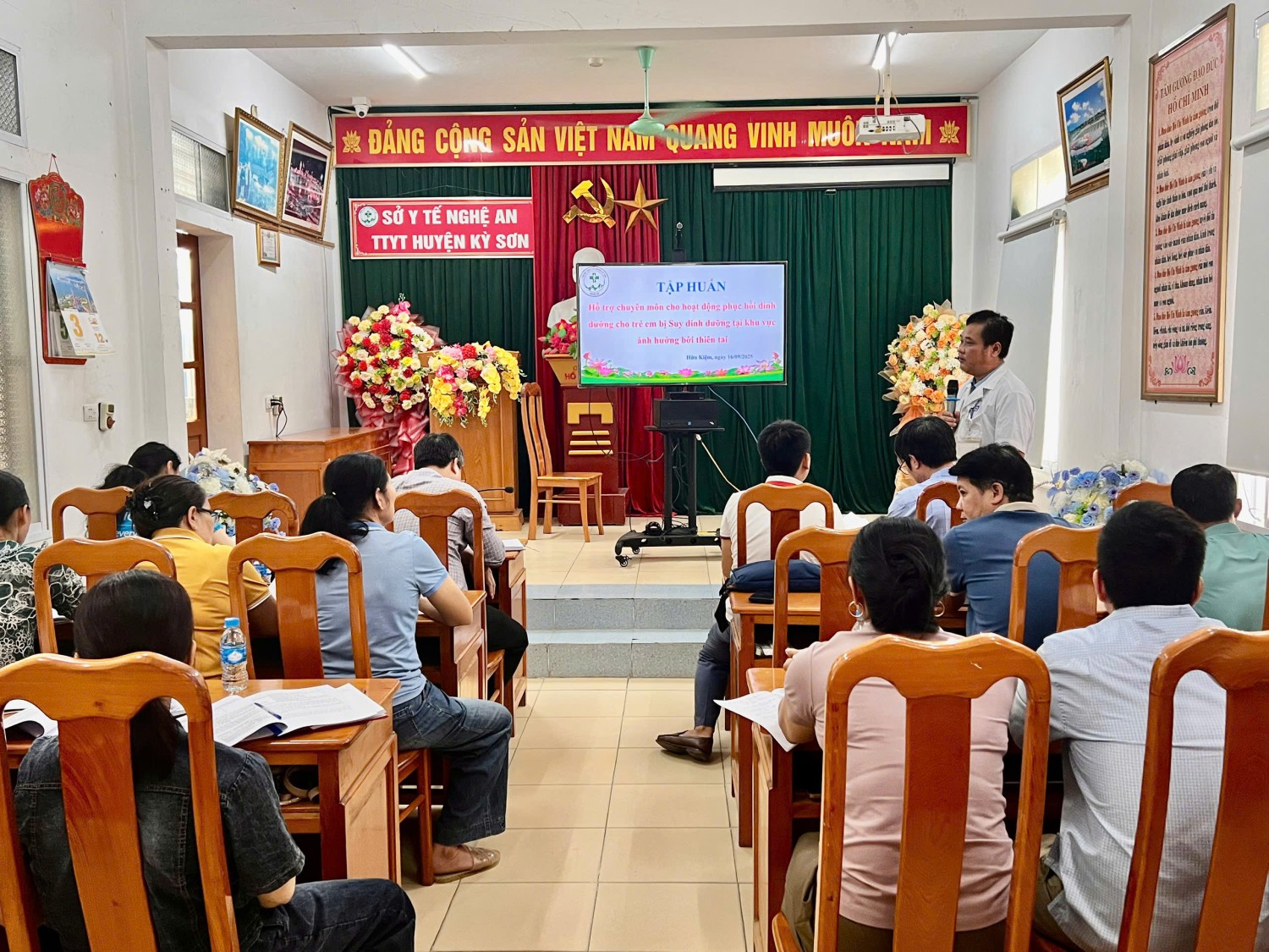 Trong 2 ngày 16-17/9/2025, Viện dinh dưỡng và Qũy Nhi đồng Liên Hiệp Quốc (UNICEF) phối hợp với Trung tâm Kiểm soát bệnh tật Nghệ An tổ chức giám sát và hướng dẫn hỗ trợ chuyên môn hoạt động phục hồi dinh dưỡng cho trẻ bị suy dinh dưỡng cấp tính. Tham dự có BSCKII. Hoàng Quốc Kiều- Phó Giám đốc CDC cùng gần 90 học viên là cán bộ chuyên trách dinh dưỡng tại Trung tâm Y tế Kỳ Sơn, Tương Dương và Con Cuông và các Trạm y tế bị ảnh hưởng bởi thiên tai vừa qua.