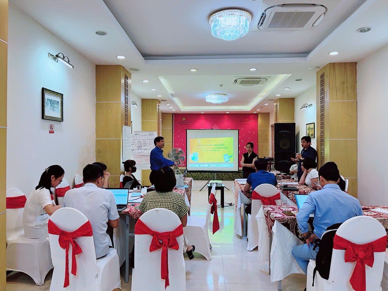 Ảnh: Giảng viên Nguyễn Văn Nhiên, chuyên gia về thanh kiểm tra lĩnh vực y tế và giảng viên Phạm Vũ Thiên, chuyên gia về phương pháp giảng dạy và truyền thông đang truyền đạt kiến thức Tại lớp tập huấn, các giảng viên đã truyền đạt một những cập nhật kiến thức về Luật Phòng chống tác hại thuốc lá và các nghị định liên quan, các quy trình về thực hiện thanh kiểm tra PCTHTL cũng như phương pháp giảng dạy truyền thông.