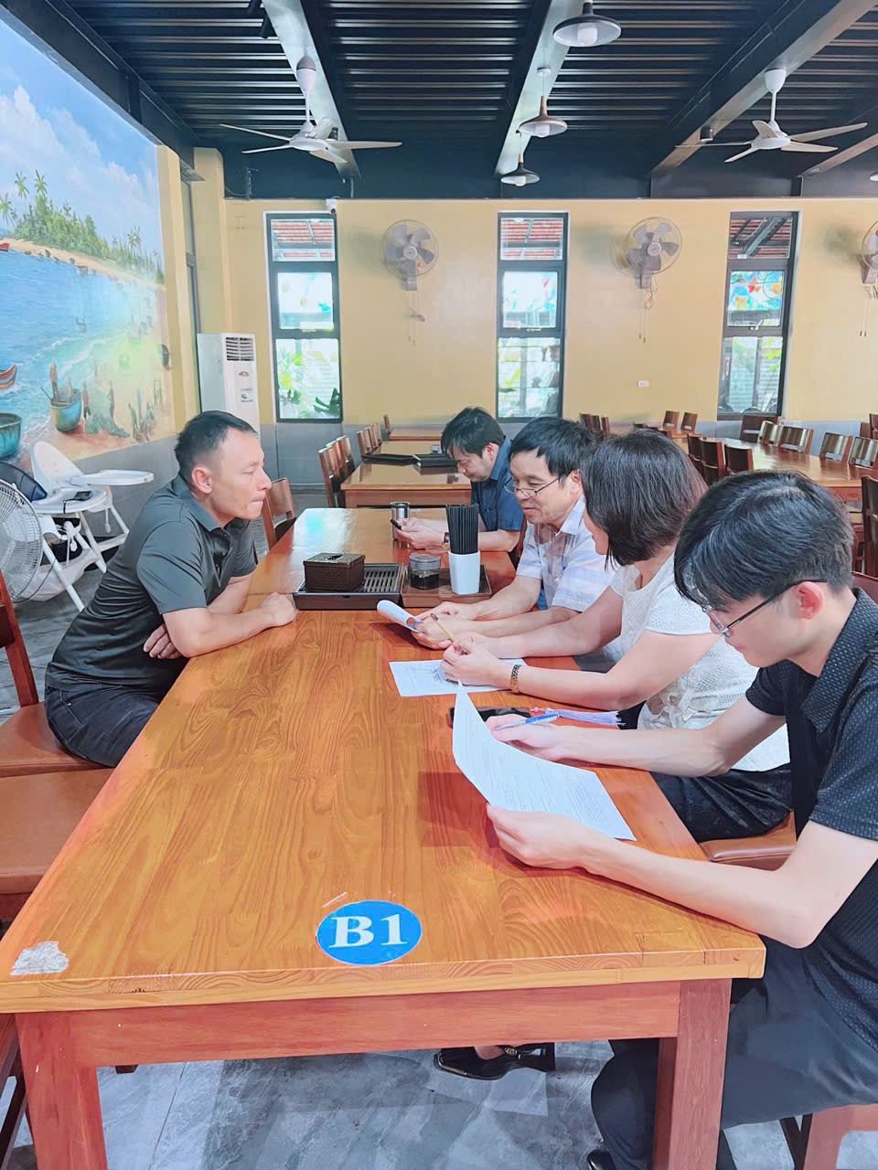 Các học viên sau khi chăm chú lắng nghe nắm bắt thông tin được truyền đạt và cùng nhau thảo luận, chia sẻ những hoạt động về thanh kiểm tra PCTHTL đã được chia nhóm thực hành tại 1 số cơ sở trên địa bàn. Ảnh: Nhóm thực hành thanh tra tại nhà hàng