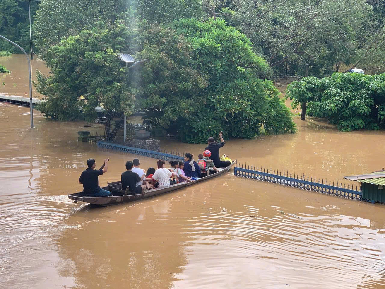 Hình ảnh bệnh nhân và người nhà bệnh nhân điều trị tại Trung tâm Y tế Tương Dương được di dời bằng thuyền