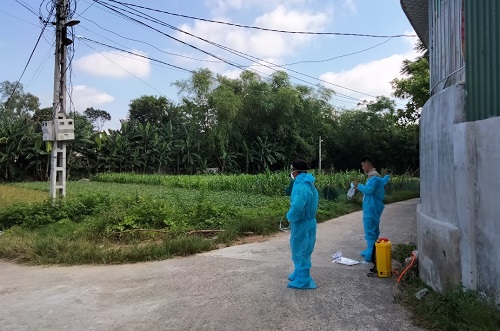 Cán bộ Trung tâm Y tế huyện Nam Đàn khẩn trương phun khử khuẩn xử lý môi trường nơi có bệnh nhân mới mắc COVID -19.