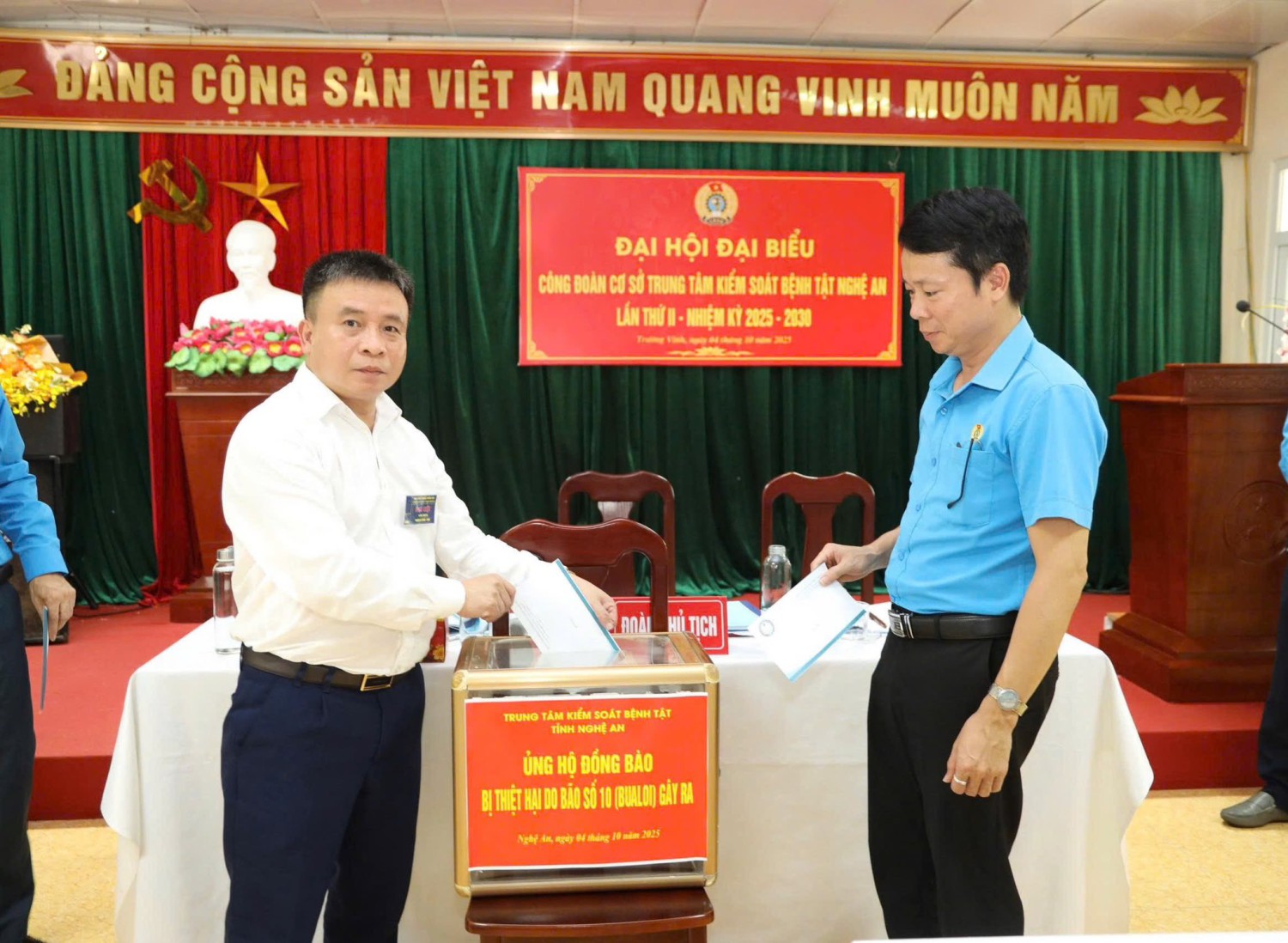 Cũng tại đại hội, Công đoàn trung tâm KSBT đã kêu gọi toàn thể đoàn viên công đoàn ủng hộ đồng bào bị thiệt hại do bão số 10 (BUALOI) gây ra. Với tấm lòng nhân ái, trách nhiệm xã hội và tình cảm sẻ chia sâu sắc. Mỗi sự đóng góp, dù ít hay nhiều, đều mang ý nghĩa lớn lao, góp phần giúp đồng bào khắc phục khó khăn, ổn định cuộc sống, khôi phục sản xuất, yên tâm lao động, học tập. Đây cũng là hành động thiết thực, thể hiện tinh thần nhân văn, trách nhiệm xã hội và phẩm chất cao đẹp của người cán bộ ngành y tế.