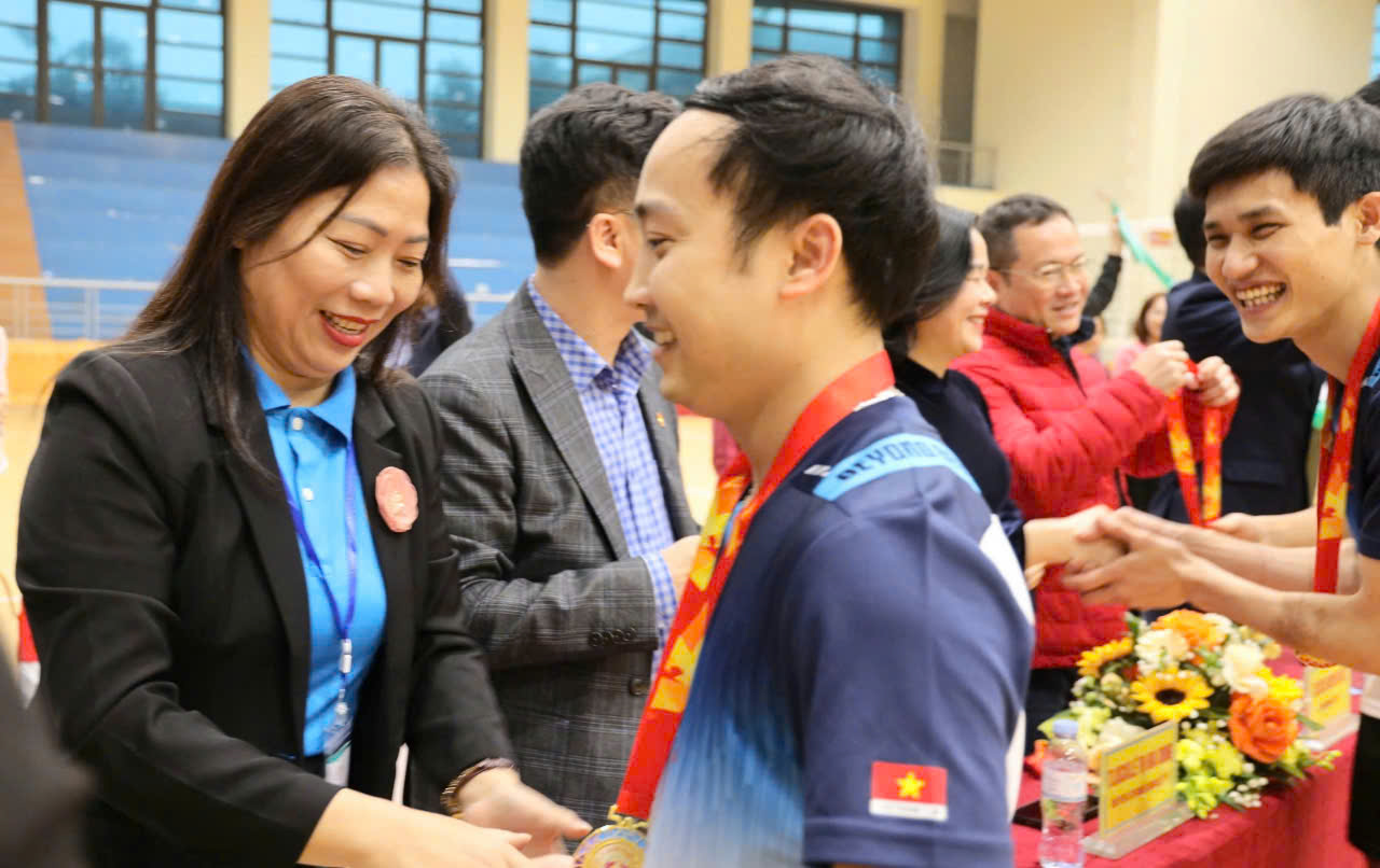 Đ/c Trần Thị Thu Hà - Chủ tịch Công đoàn ngành y tế;trao Huy chương và phần thưởng cho các đội đạt giải Thể thao bóng chuyền hơi Nam nữ Kỷ niệm 70 năm ngày Thầy thuốc Việt Nam 27/2/2025